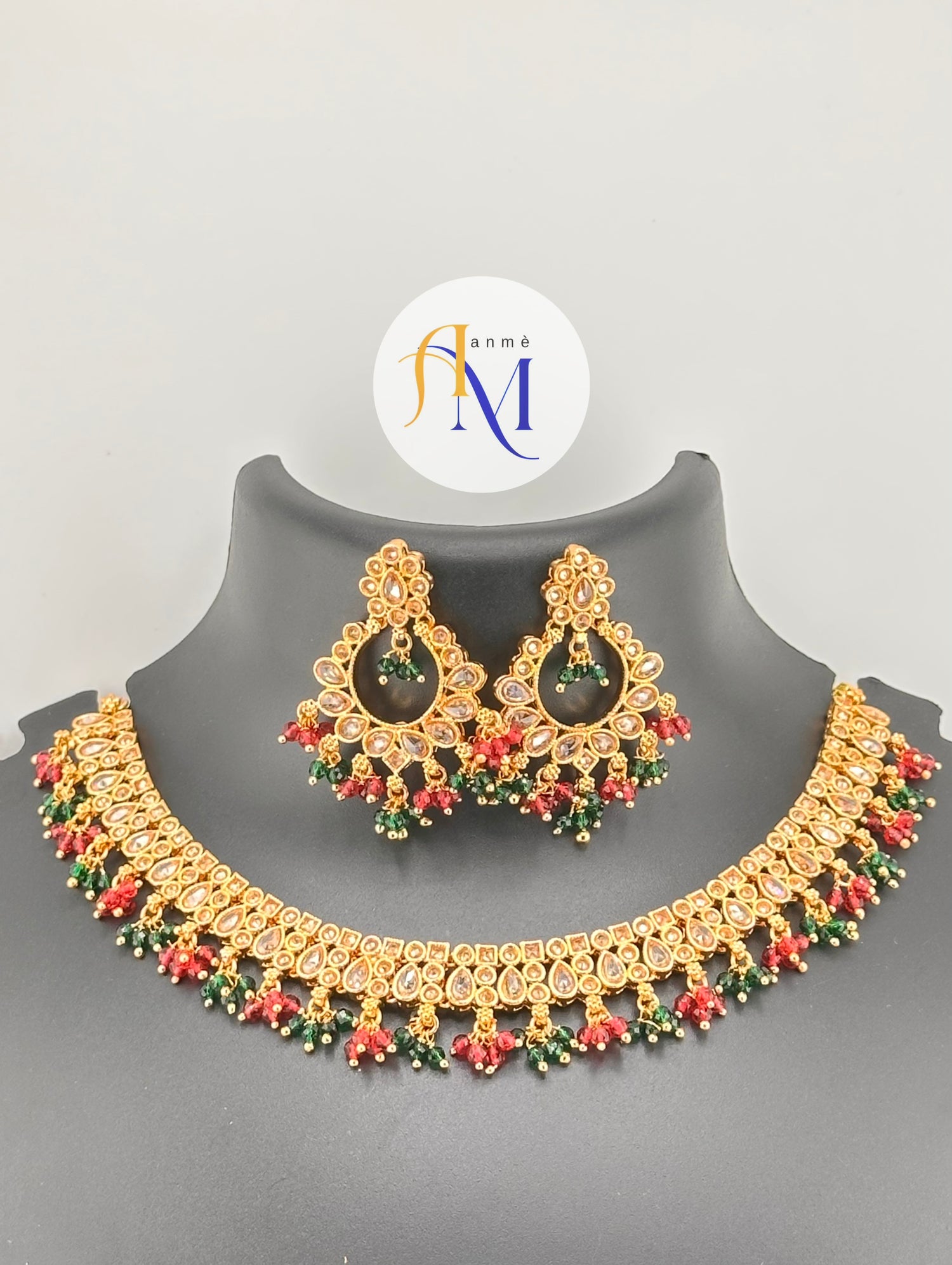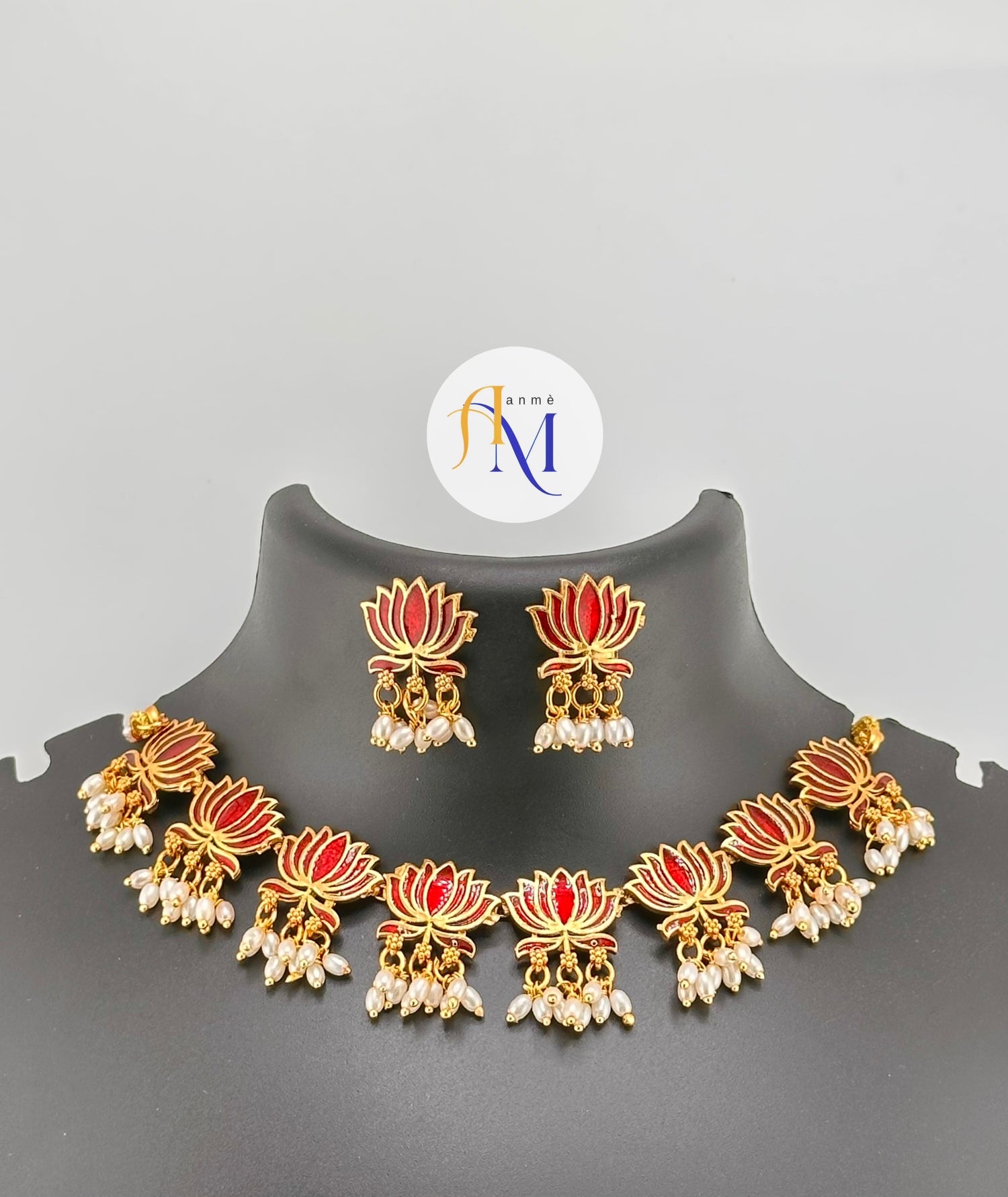 Trending Lotus necklace with white pearl hangings and earrings(Maroon-Maroon-Green)