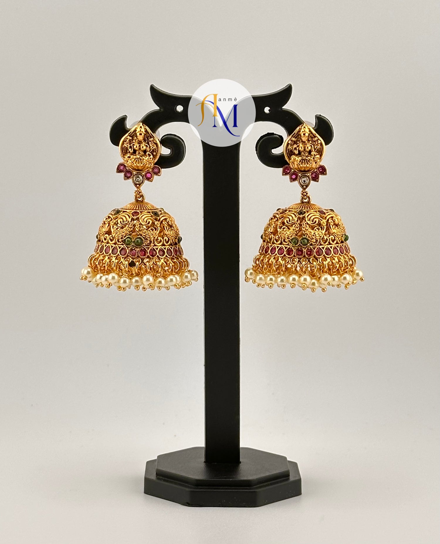 Antique temple design Jhumkas with ruby-green stones and white pearl hangings