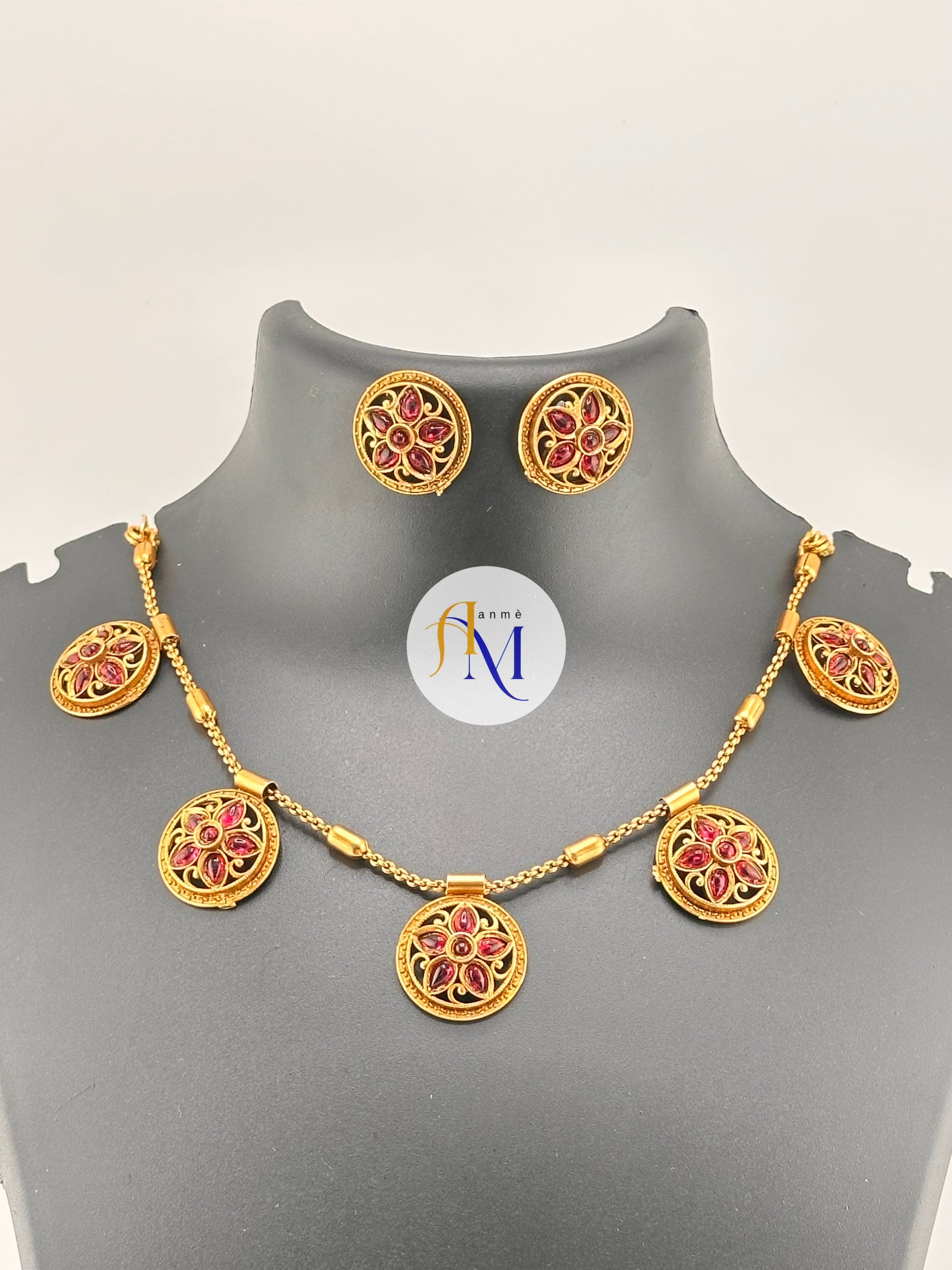 Antique gold toned medallions featuring white-green-ruby stones necklace/choker set