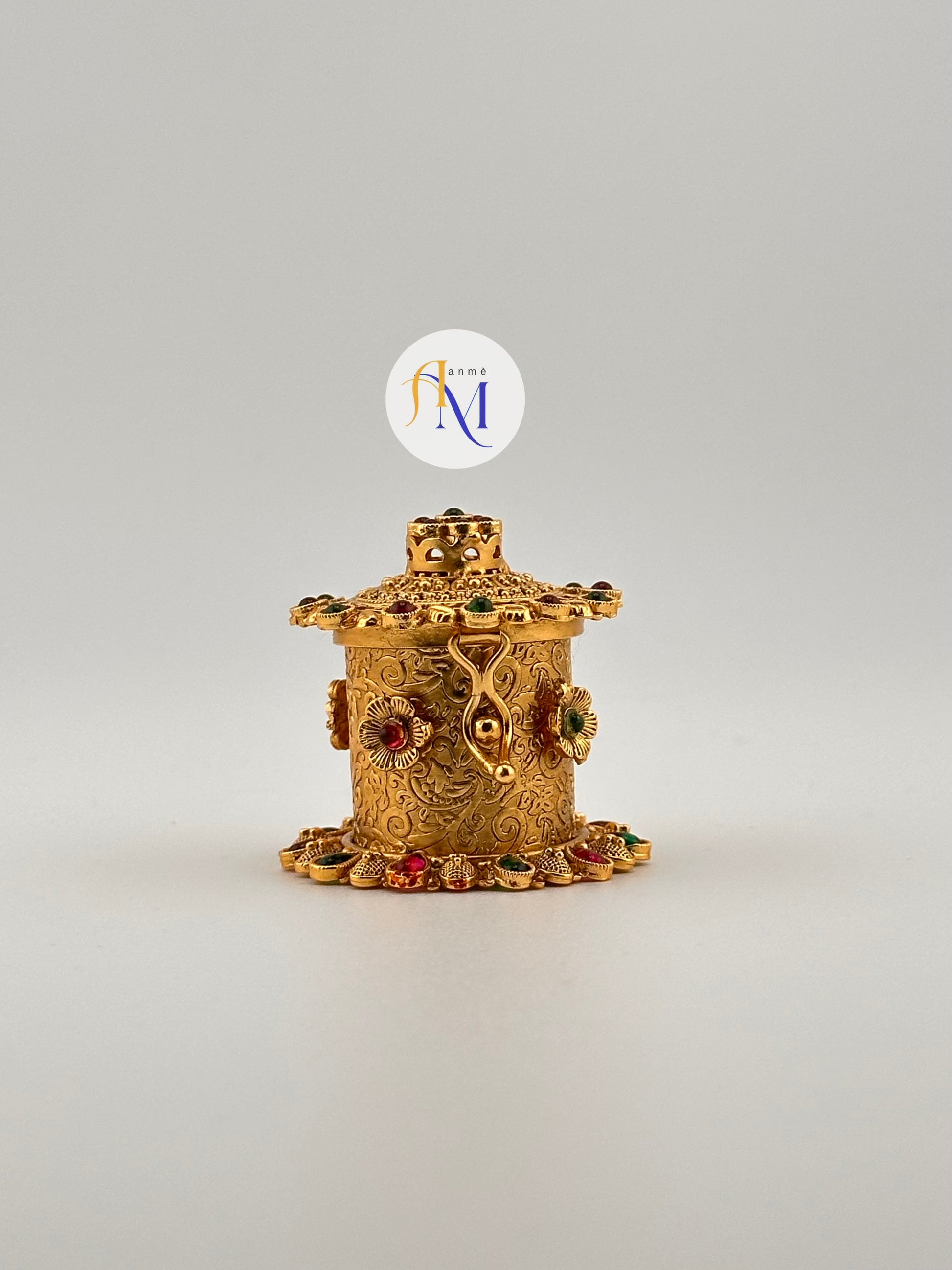 This exquisite kumkum box features intricate floral designs adorned with striking ruby and green stones. Crafted to blend traditional artistry with elegance, it offers a refined storage solution for your kumkum. Its compact size and vibrant embellishments make it both a functional and decorative piece, ideal for enhancing your ritual space or gifting to those who appreciate fine craftsmanship.