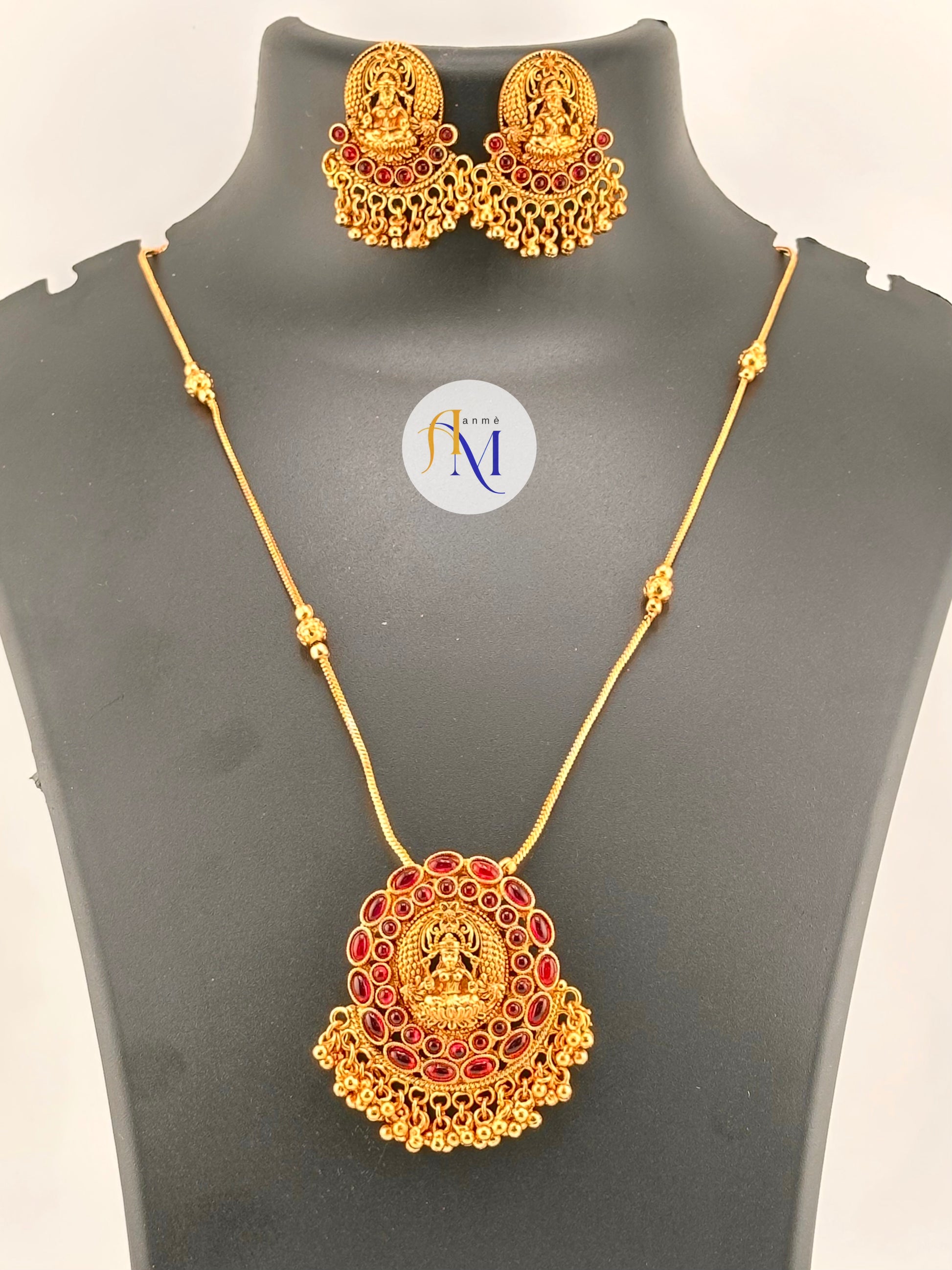 Beautiful Lakshmi pendant with ruby stones and simple golden chain long haram