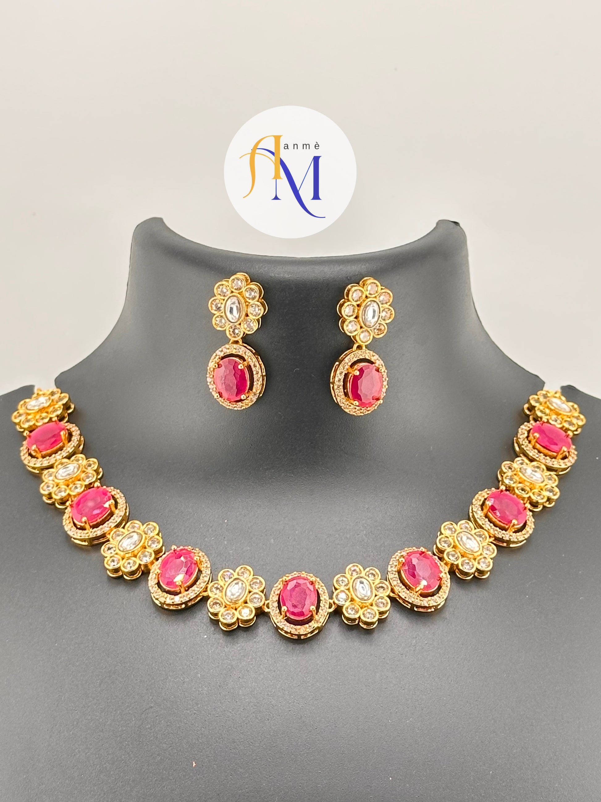 This exquisite ruby-toned AD necklace and earring set combines timeless elegance with meticulous craftsmanship. Featuring richly hued ruby accents paired with sparkling AD stones, the set offers a sophisticated look suitable for formal occasions. Its balanced design enhances your neckline while the matching earrings provide a refined finishing touch, making it an ideal choice for those appreciating classic jewelry with a vibrant twist.