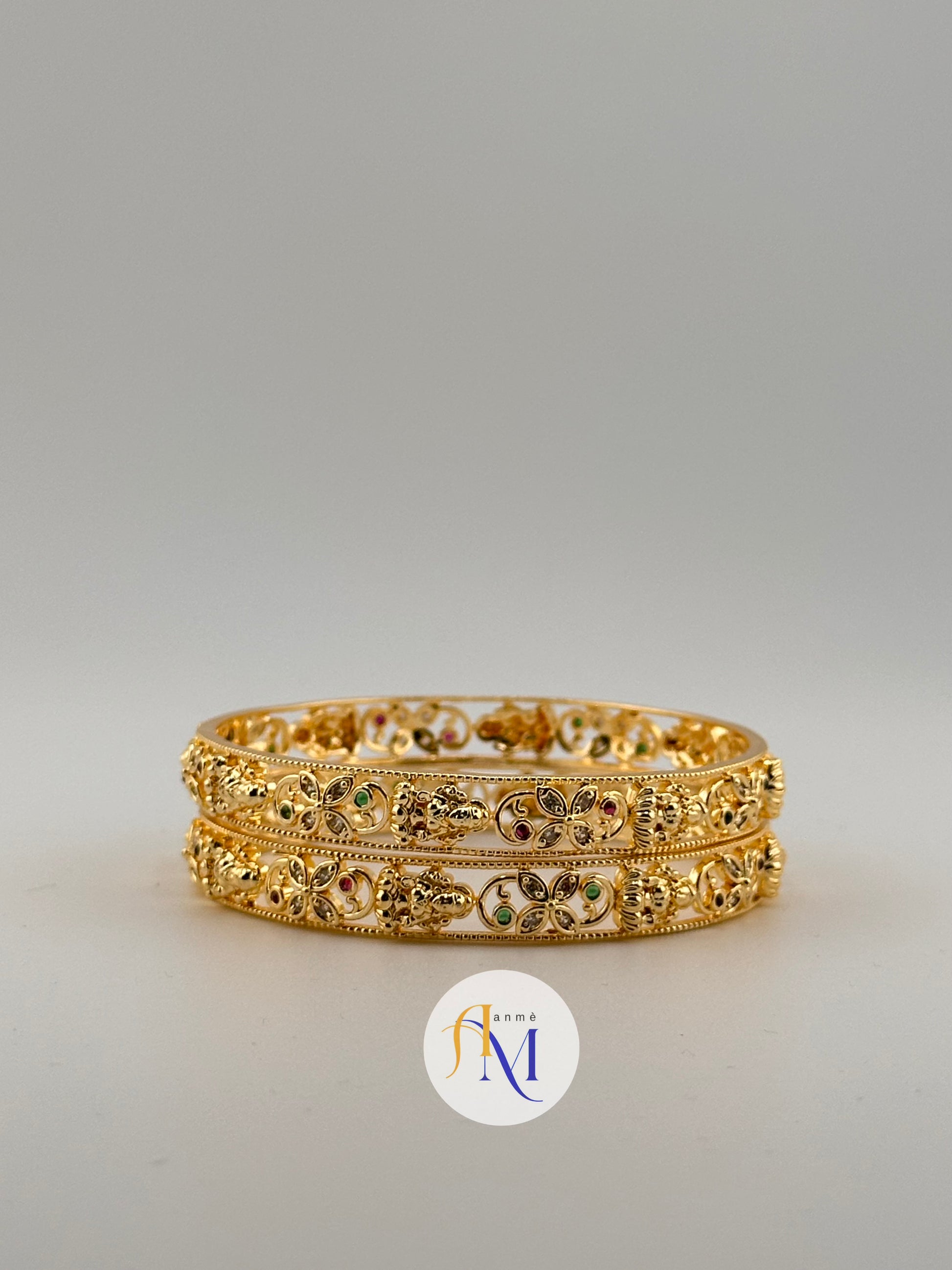 Celebrate elegance and tradition with these exquisitely crafted bangles featuring a bright Lakshmi motif intertwined with delicate floral designs. Adorned with ruby red, emerald green, and sparkling white stones, these bangles bring a vibrant yet balanced palette to your ensemble. Perfect for festive occasions or enhancing your everyday look, they offer a sophisticated blend of cultural symbolism and refined craftsmanship.