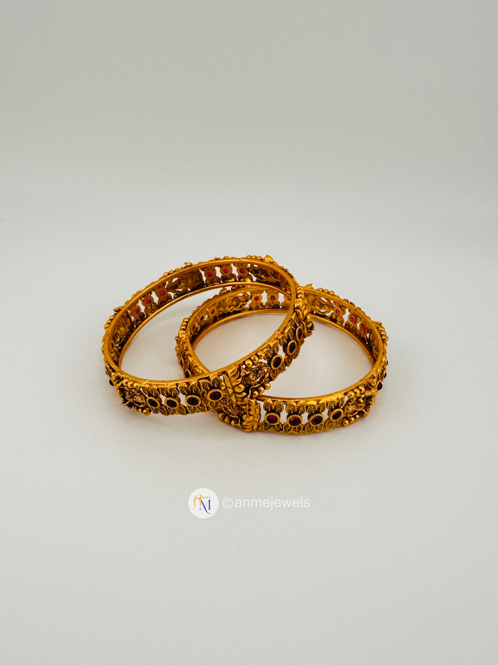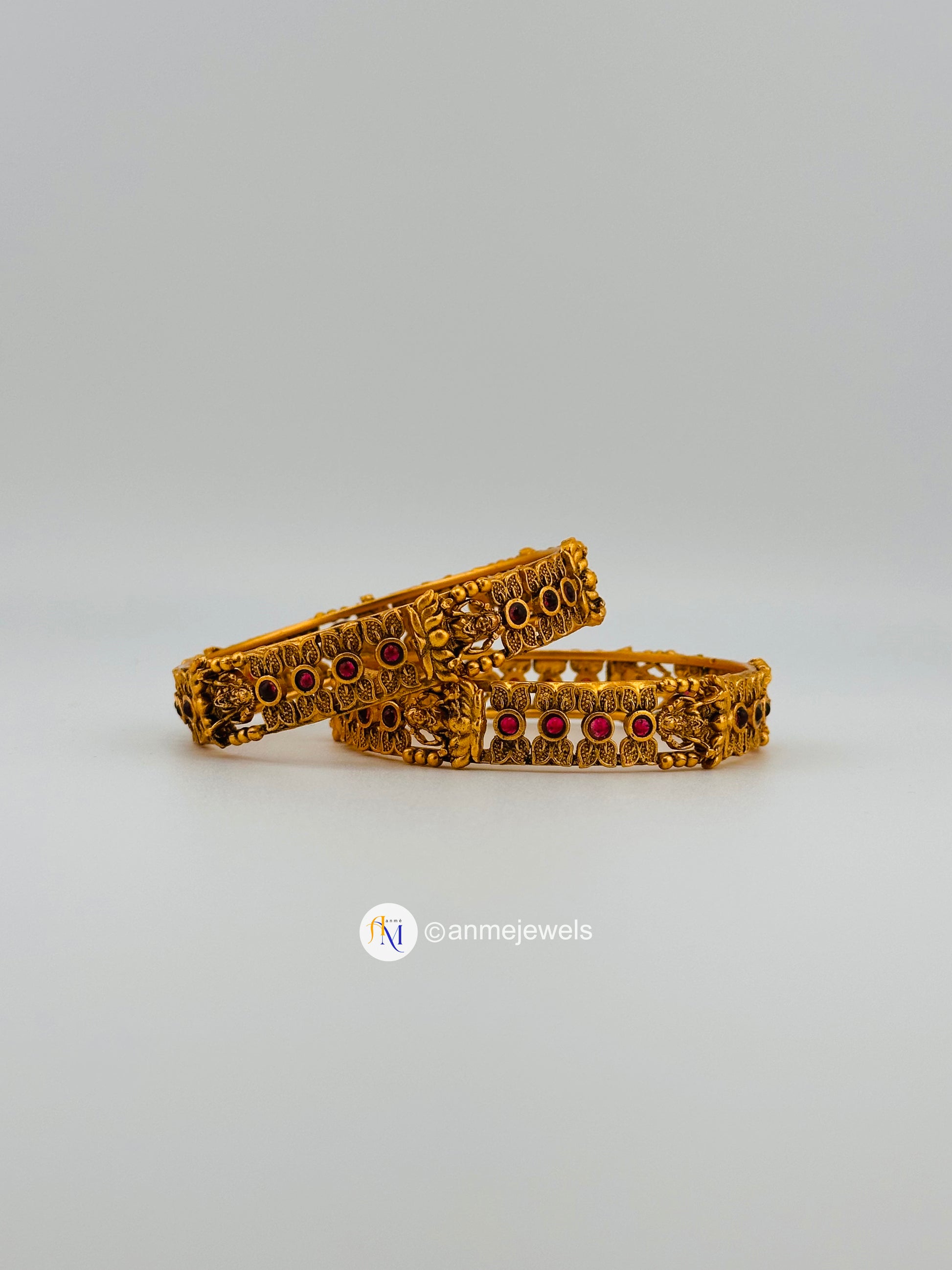 This exquisite bangle set features a refined matte finish, adorned with delicate ruby floral motifs and a detailed Goddess Lakshmi design. Crafted to blend traditional symbolism with contemporary elegance, it offers a sophisticated accessory that enhances any ensemble while embodying prosperity and grace. Ideal for special occasions or daily wear, this set combines artistry and cultural significance in a timeless piece.