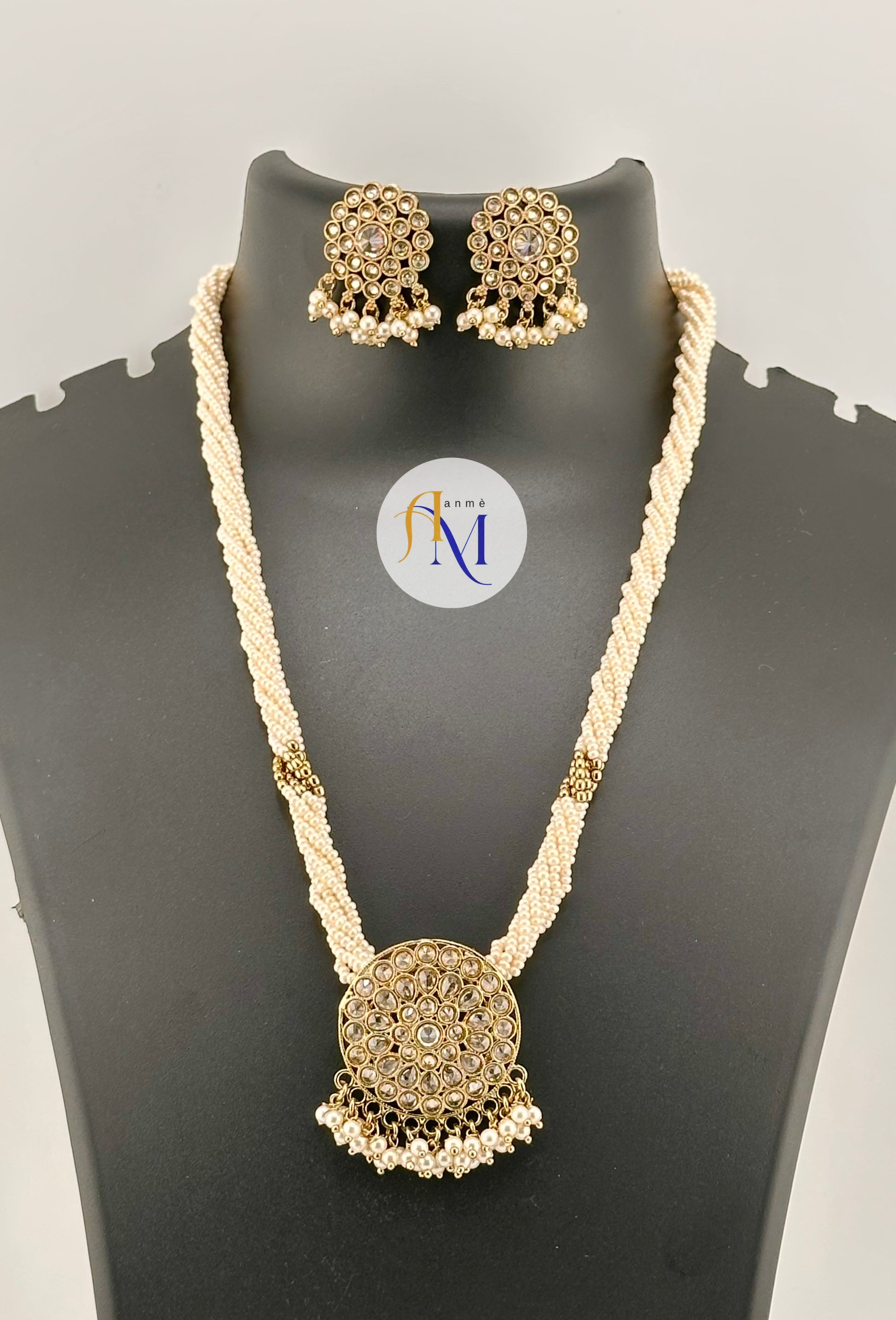 Elegant White Pearl Long necklace with beautiful white stones pendant with pearl hangings and earrings