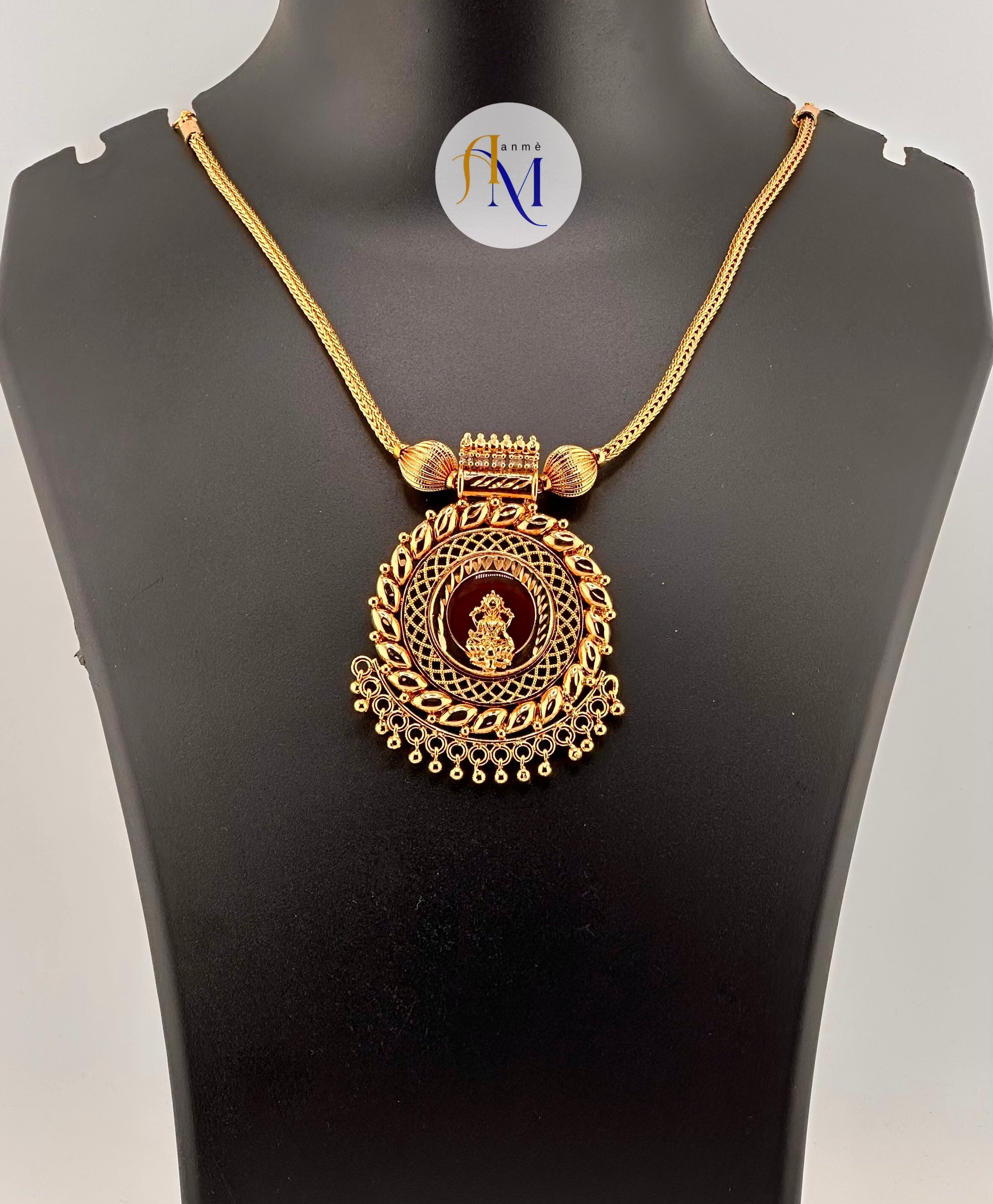 This elegant necklace features a round pendant showcasing the goddess Lakshmi against a rich maroon background. The design symbolizes prosperity and well-being, making it a meaningful accessory for daily wear or special occasions. Crafted to balance spiritual significance with refined style, this pendant brings a touch of tradition to any outfit.