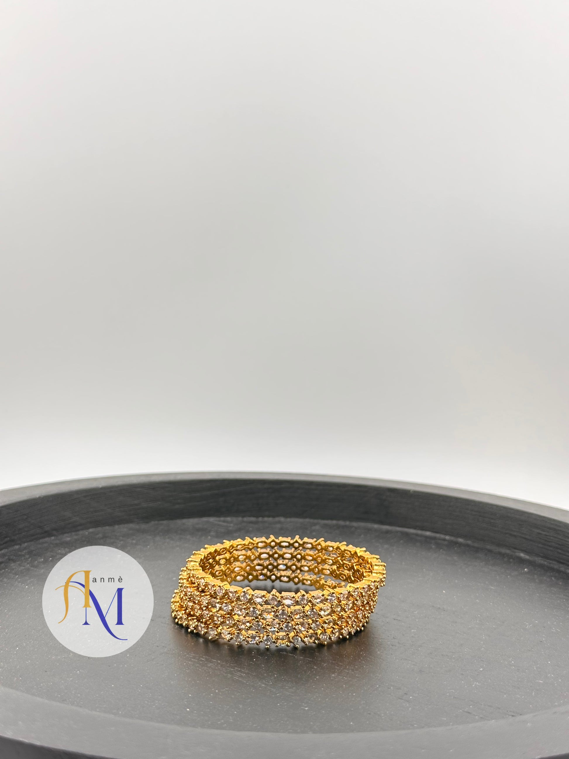 Elevate your child's style with this set of two sparkling and luxurious AD bangles, crafted to blend tradition with elegance. These bangles feature exquisite detailing that adds a refined touch to any outfit, perfect for special occasions or daily wear. Lightweight and comfortable, they are designed to complement a young wearer’s delicate wrists while offering durability and lasting shine. A sophisticated accessory choice that enhances your child’s charm with subtle brilliance.