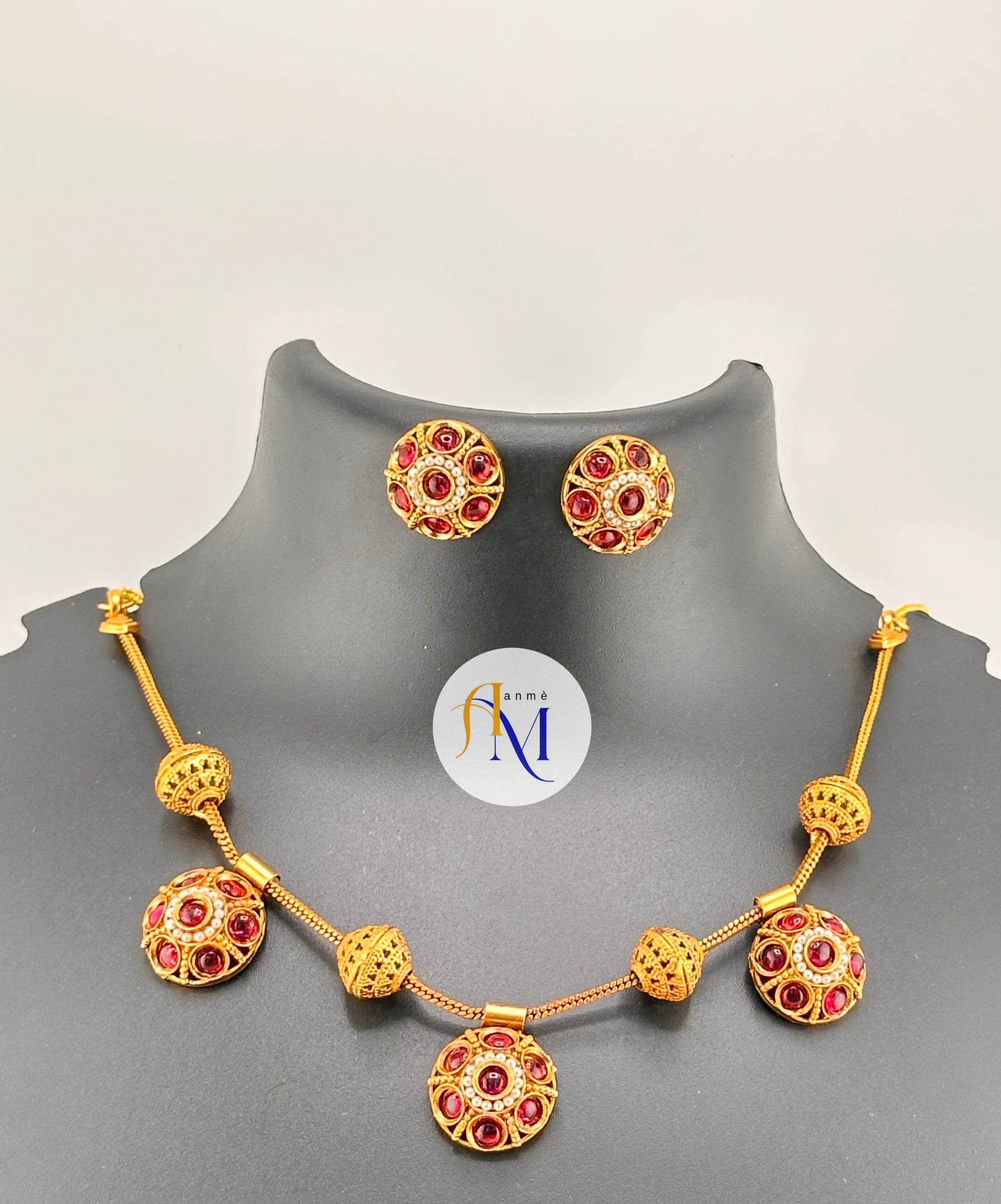 Traditional gold toned finish with ruby-green and white stones necklace set