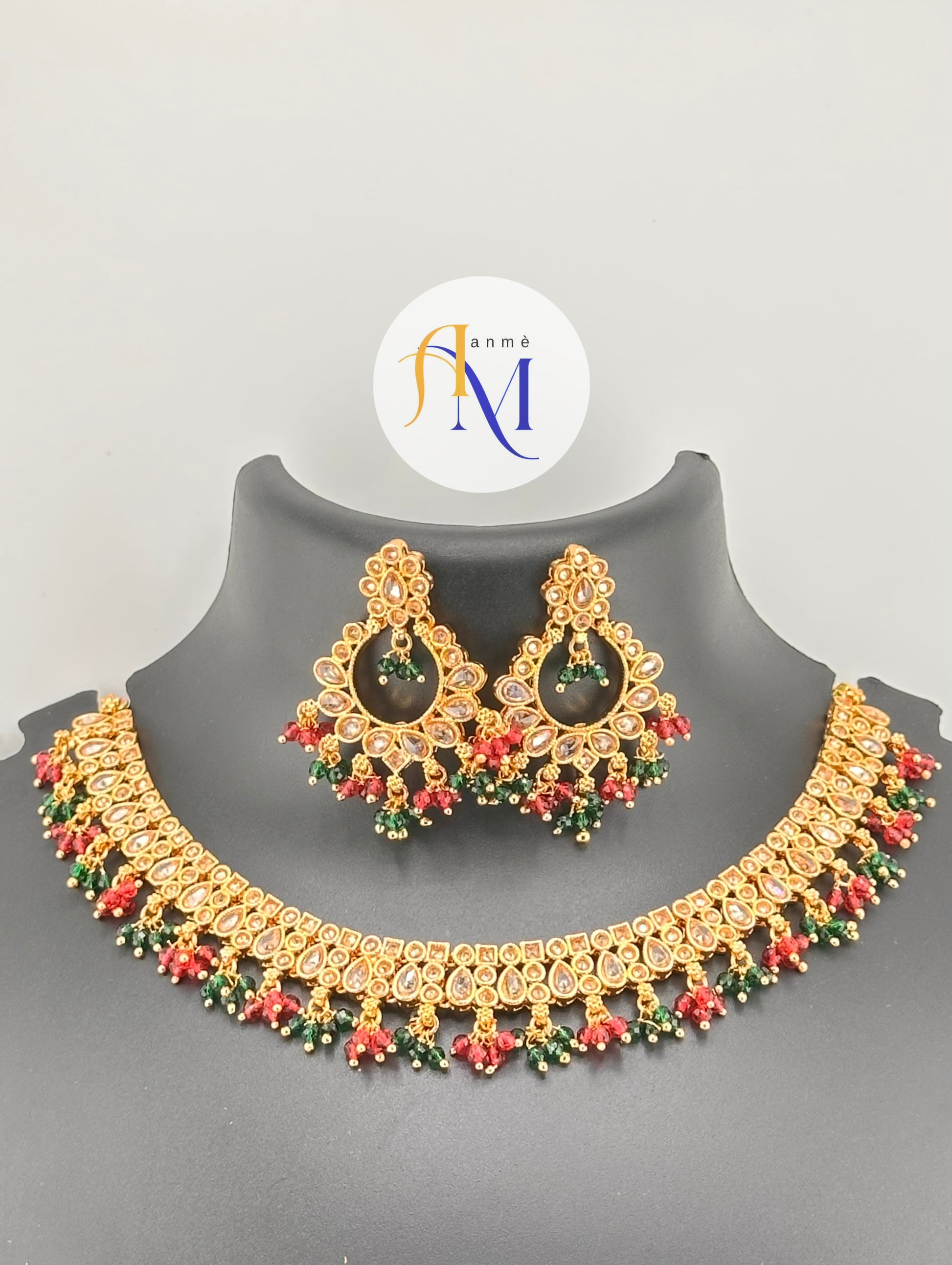 Traditional Indian Kundan Choker Necklace and Earring Set featuring multi-color beadwork