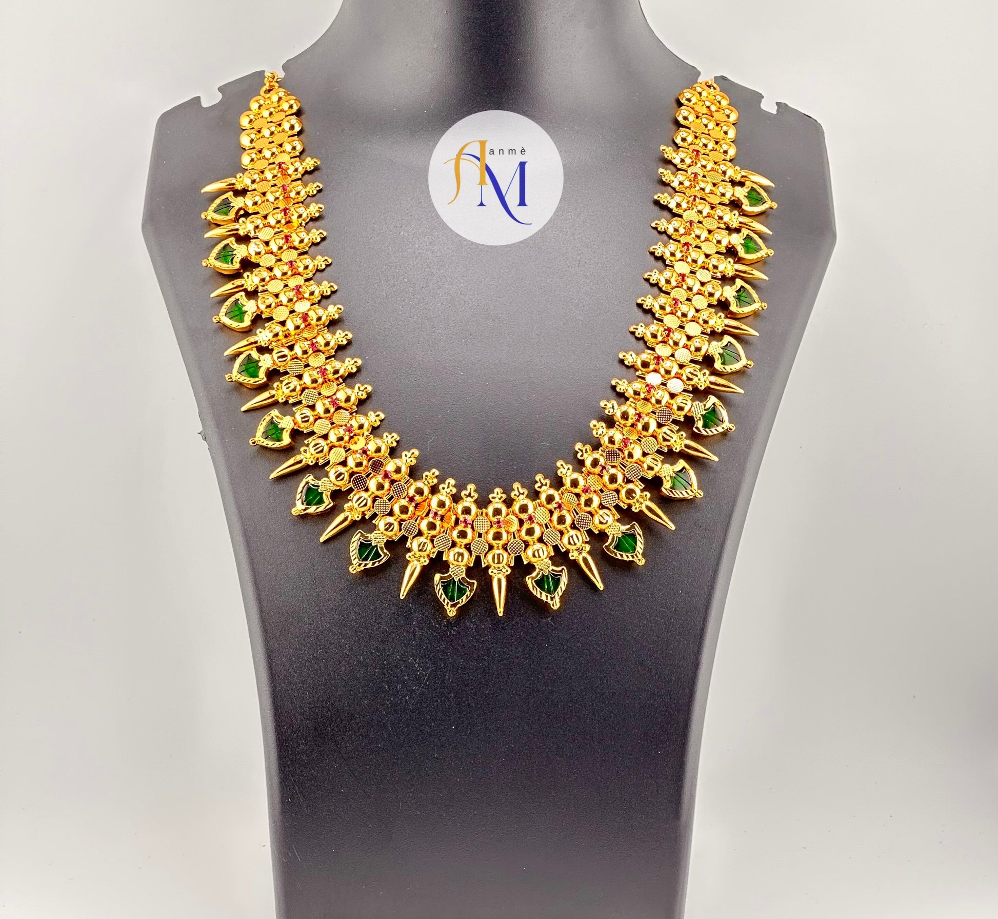 This exquisite Traditional Mullamottu (Jasmine) and Palakka long haram showcases intricate craftsmanship rooted in timeless elegance. Combining the delicate beauty of jasmine-inspired design with the classic appeal of palakka work, this long haram adds a sophisticated touch to any traditional ensemble. Perfect for weddings and special occasions, its detailed artistry highlights cultural heritage while enhancing your graceful presence with lasting charm.