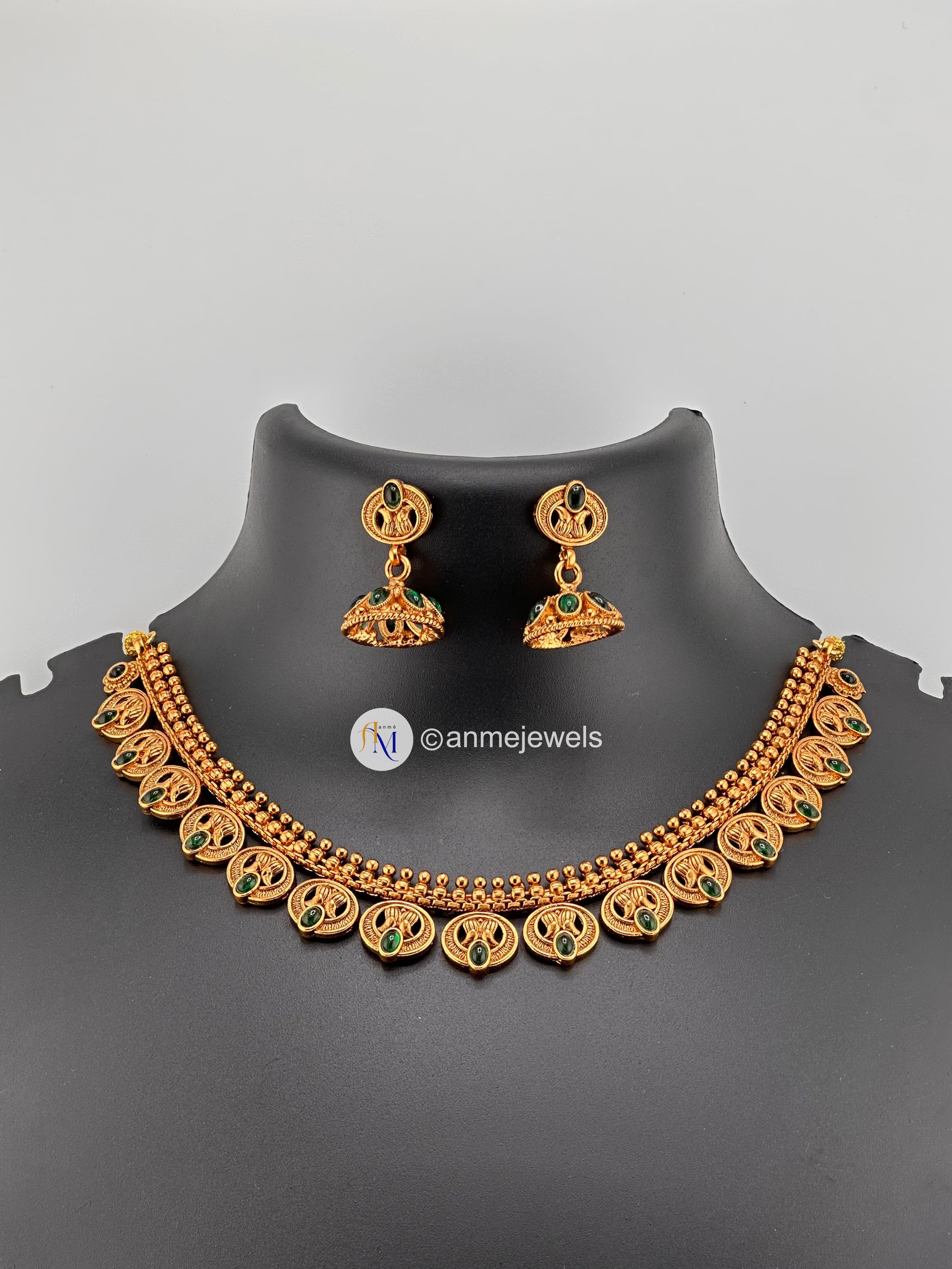 Crafted with meticulous attention to detail, this Antique Temple Design Necklace Set showcases traditional artisanship reimagined for the modern connoisseur. The distinctive temple motifs evoke cultural heritage while maintaining contemporary elegance. Each element is precisely positioned to create a balanced composition that draws attention to the neckline. Perfect for special occasions where sophisticated statement pieces are desired.