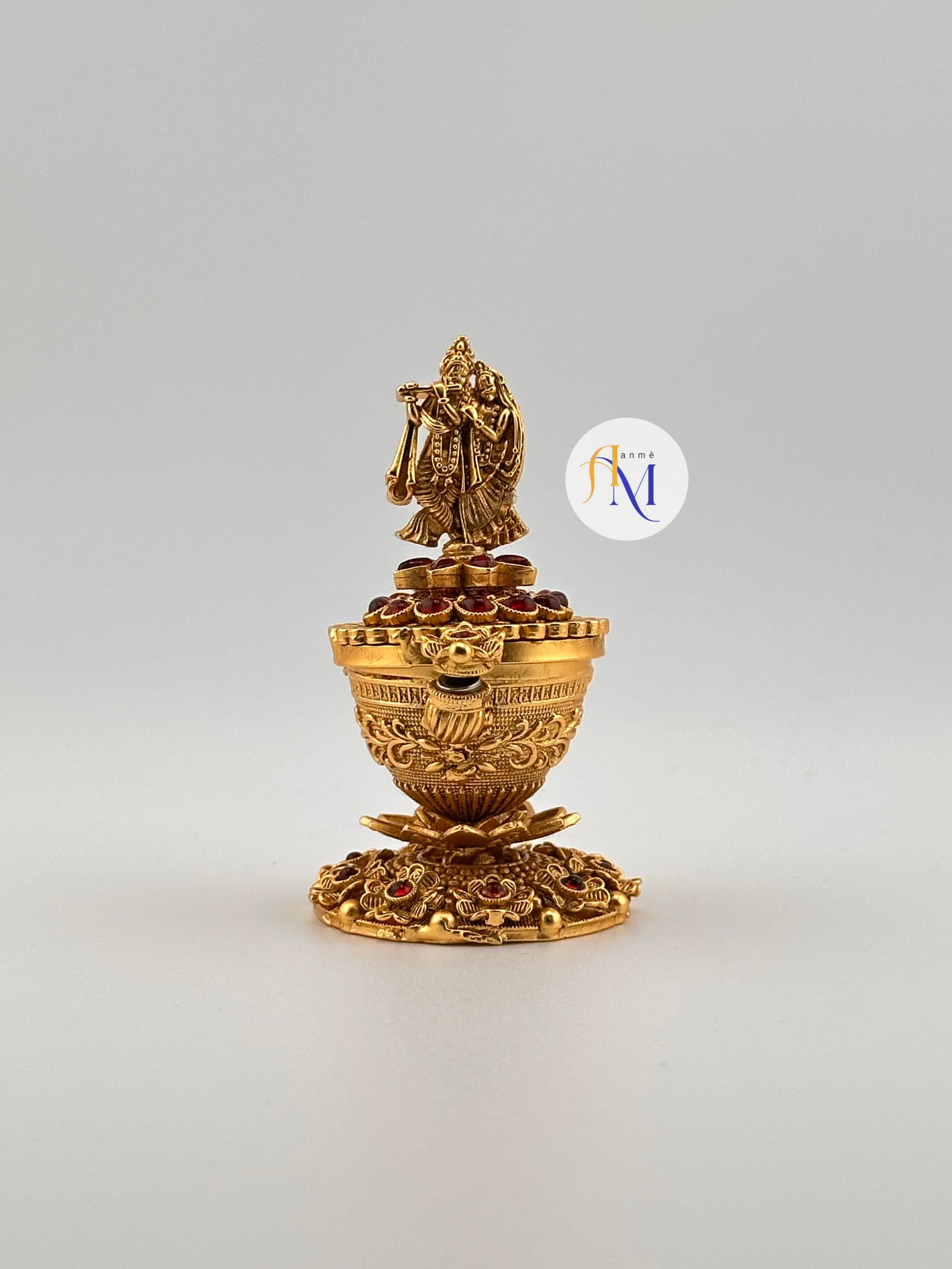 Unique Radha Krishna Kumkum box/Kumkuma cheppu/Sindoor dappi with ruby-green stones(Available in 2 colors)